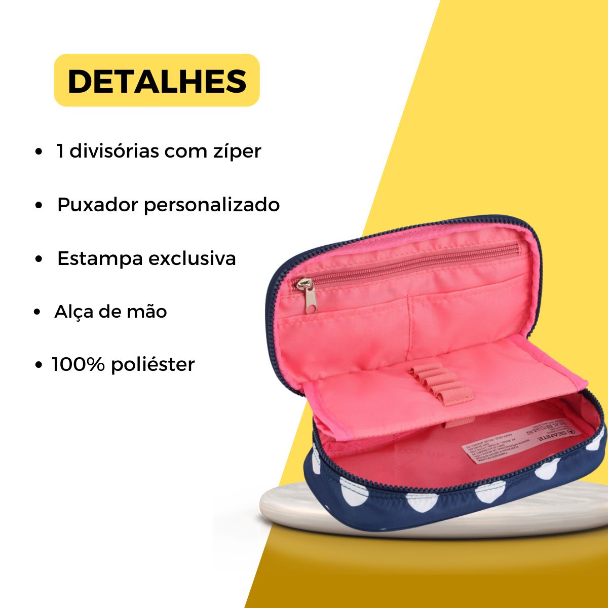 Fabricado com material resistente e fácil de limpar, o estojo conta com divisória interna e bolso com zíper, garantindo espaço e segurança para seus itens.
