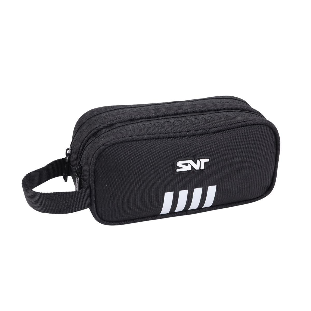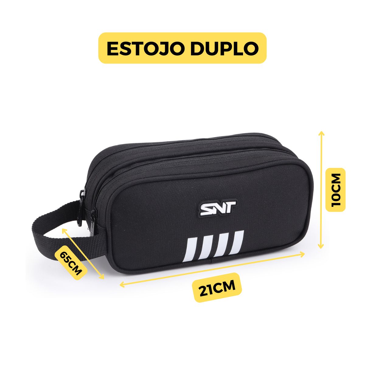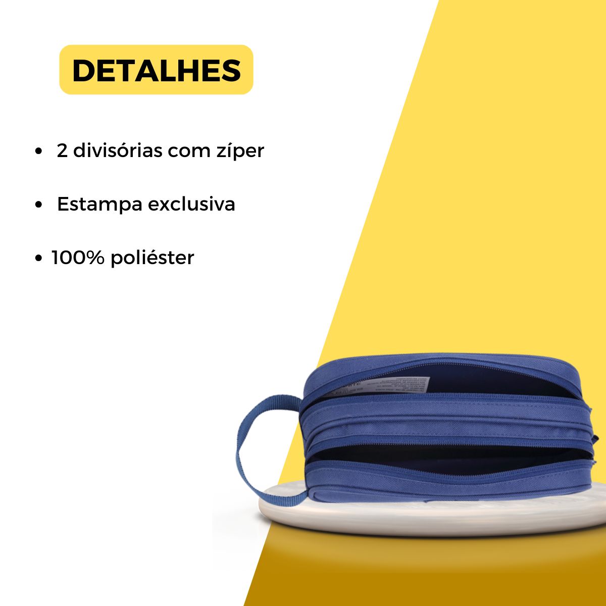 Produzido em 100% poliéster de alta durabilidade, o estojo possui duas divisórias amplas com zíper reforçado, permitindo armazenar canetas, lápis, borrachas e acessórios com total segurança.