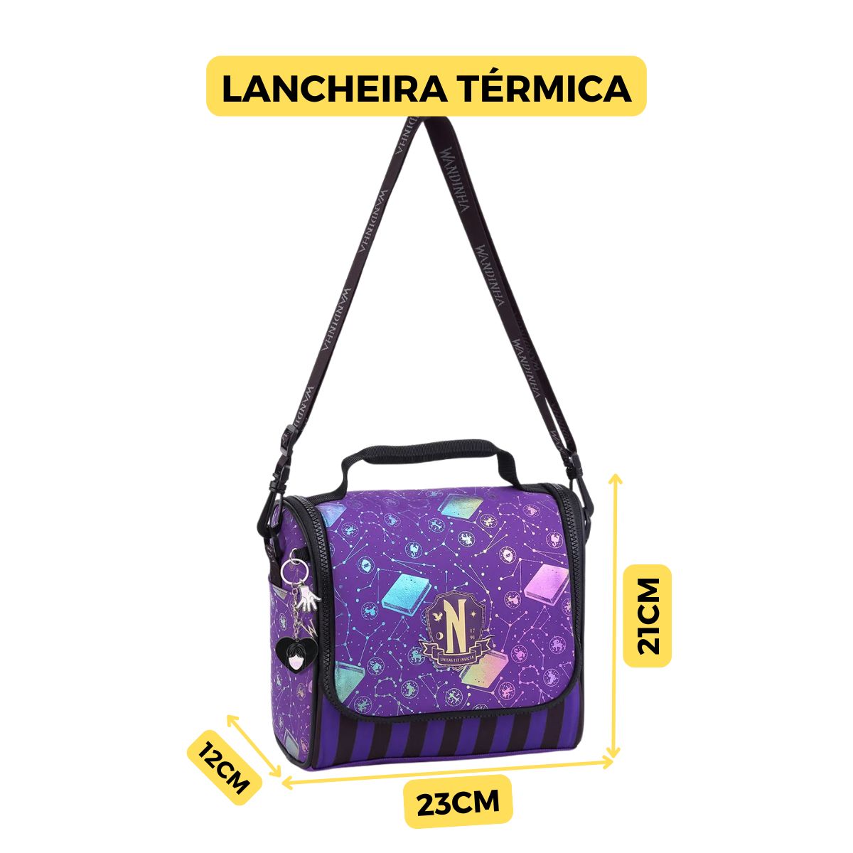 A lancheira térmica Wandinha é ideal para manter seus alimentos conservados e organizados durante a rotina escolar ou no dia a dia. Produzida em 100% poliéster, possui acabamento resistente e estampa holográfica exclusiva inspirada no universo de Wandinha.