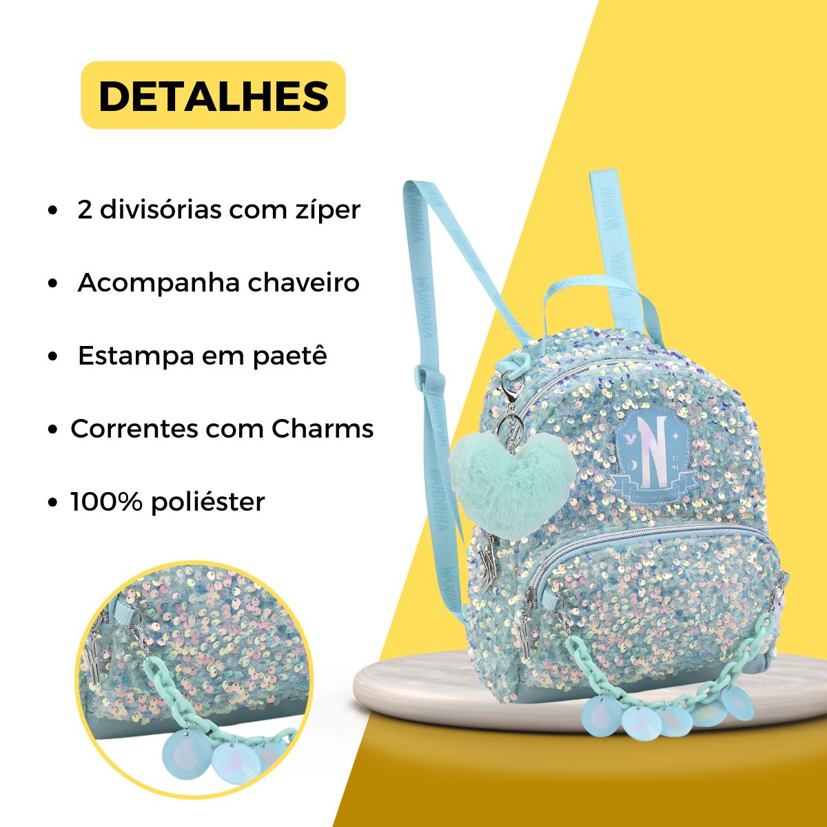 A Mini Mochila Wandinha Addams é o acessório perfeito para quem ama unir moda e atitude. Inspirada na personagem mais icônica da série, ela traz um design cheio de charme com lantejoulas pretas e roxas, que mudam de cor conforme a luz, criando um visual moderno e exclusivo.
