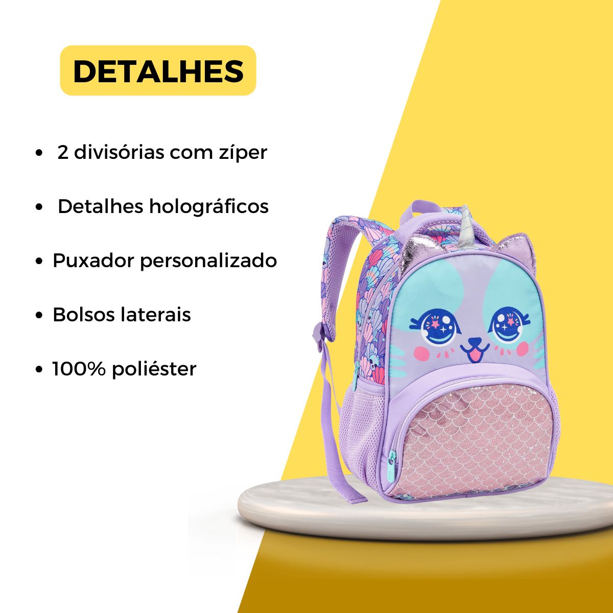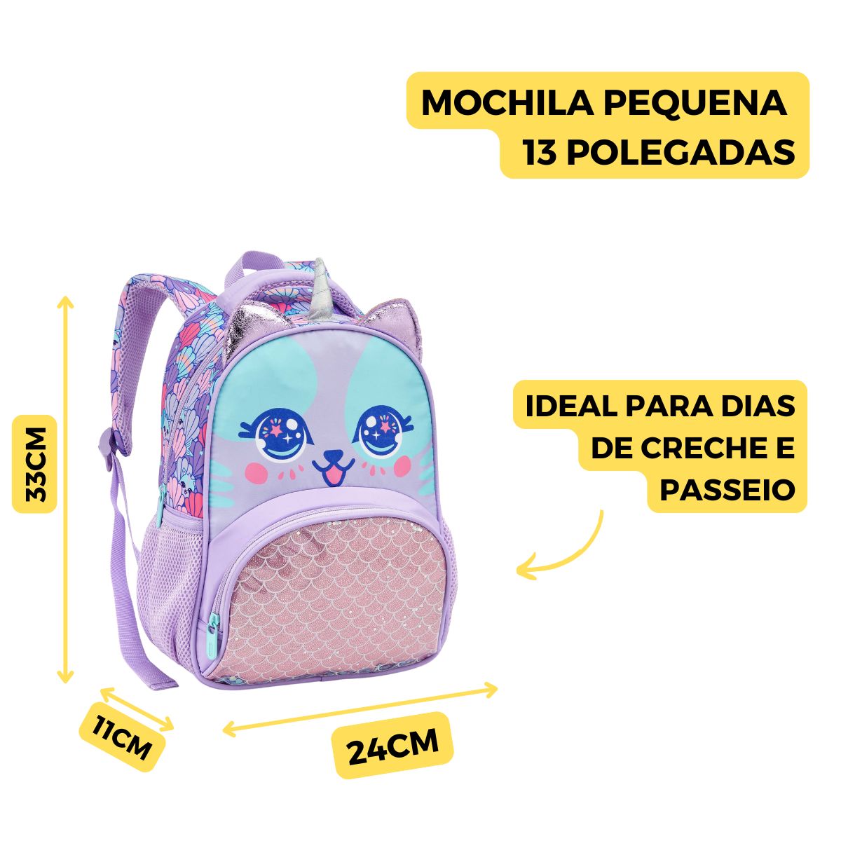 Dimensões: 24 cm (L) x 33 cm (A) x 11 cm (P), com volume de 9L, ideal para transportar tudo o que os pequenos precisam.